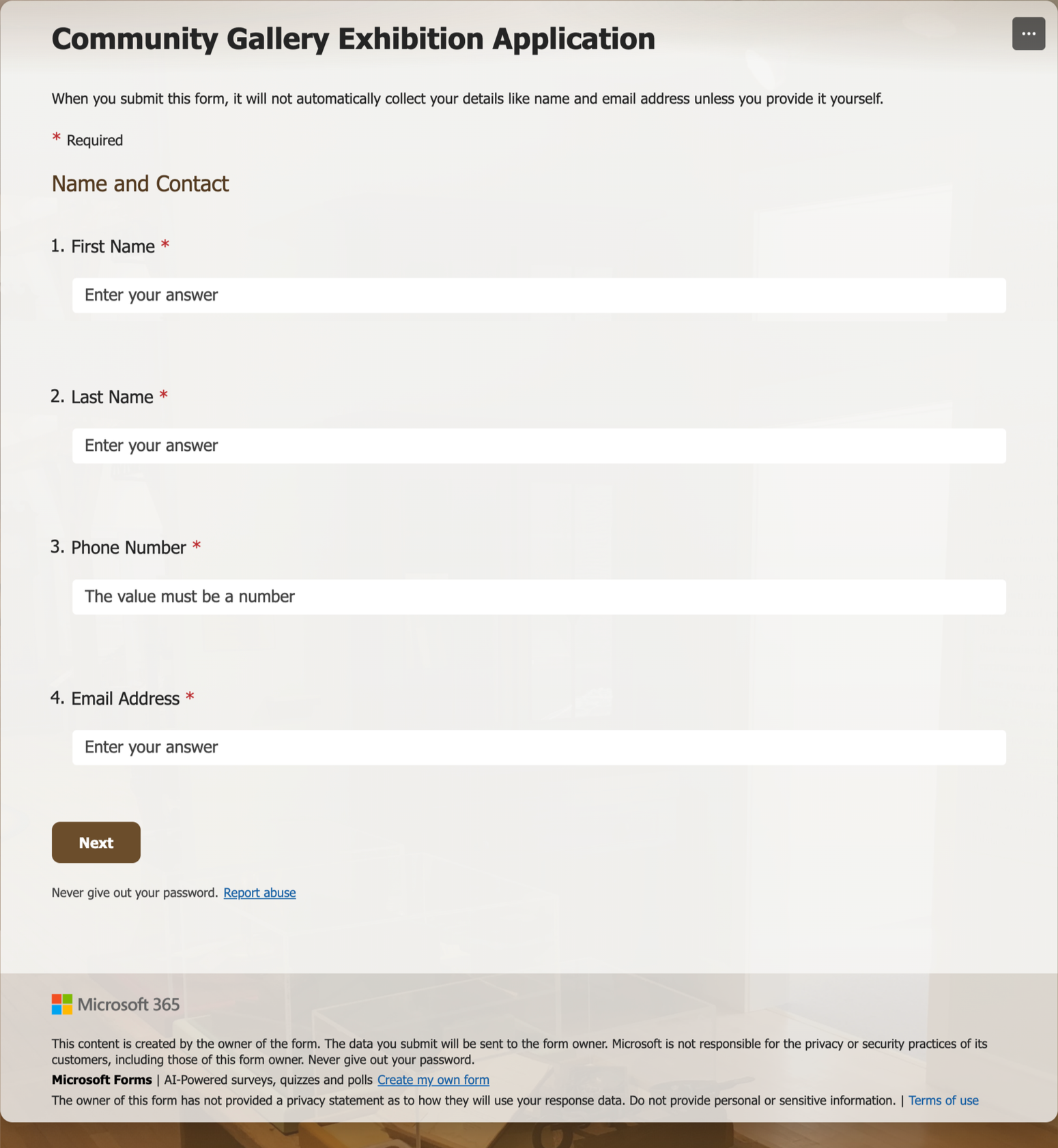 All artists must be Maryland residents, preferably from Montgomery County, but not required.