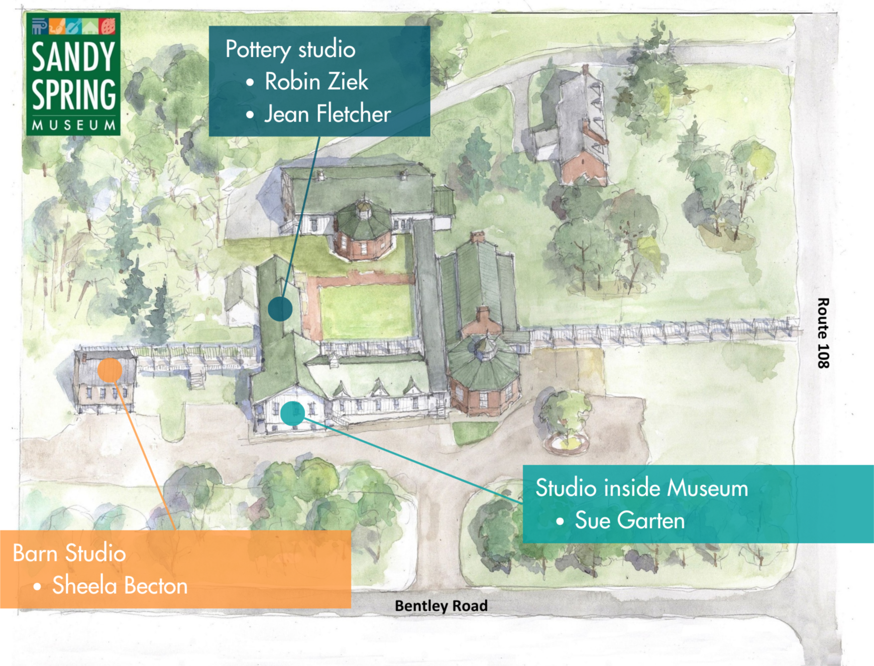 Nine artists create original work in studios located at the Museum. Artist studios are a visual treat. Three studios are housed in a converted 19th-century barn with exposed timber peg joints. A pottery studio, also housed in a converted barn, is located in the courtyard, and two studios are located inside the Museum. Resident artists are sculptors, metalsmiths, potters, and mixed media artists who draw inspiration from nature, history, and the Museum's collection among many other sources.